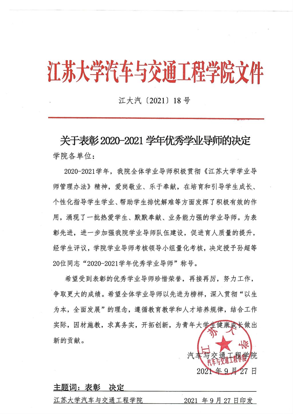 关于表彰2020-2021学年汽车学院优秀学业导师的决定