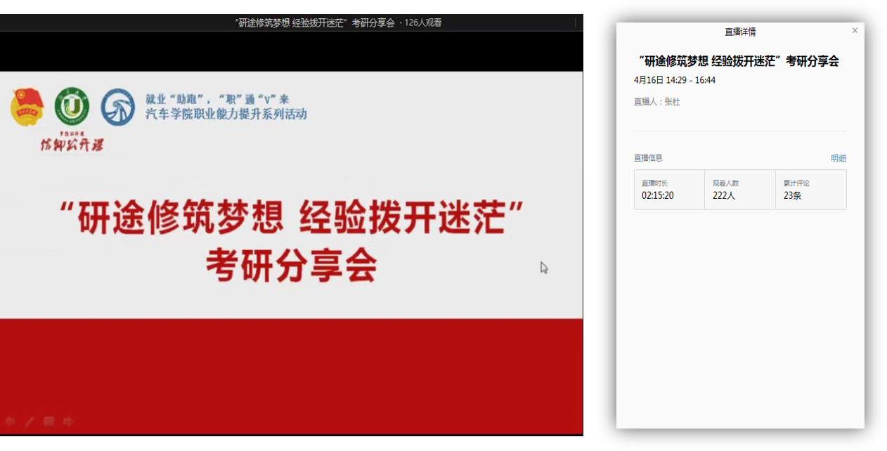 4月16日,汽车学院通过企业微信乐享小直播平台举办考研经验交流会,院团委副书记陈佳楠、本科生辅导员张杜、孙姗姗、王超越以及本科2019级两百余名同学参加。