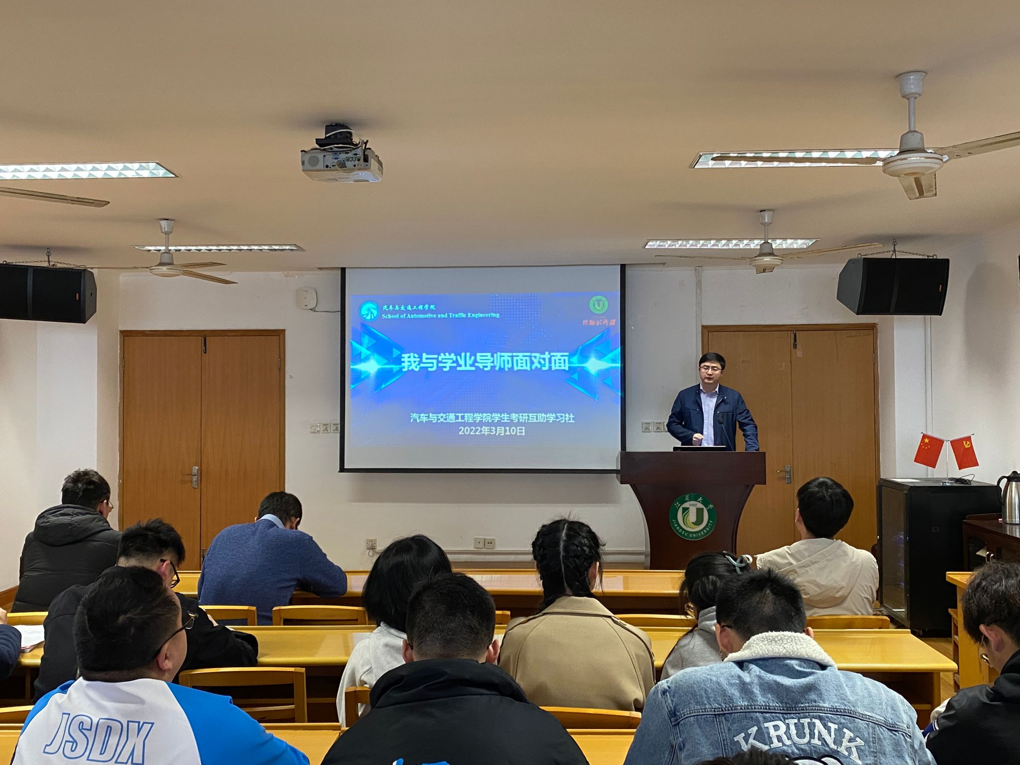 为精准助力考研学子备考,提升学生考研成功率,3月10日,汽车学院学生考研互助学习社在学院311报告厅举办2022年考研复试指导系列讲座(3)——我与学业导师面对面。本次座谈会邀请了车辆、动力、交通、运输专业四名学业导师为主讲嘉宾,2018级辅导员孙姗姗主持,100余名考研学生参加。