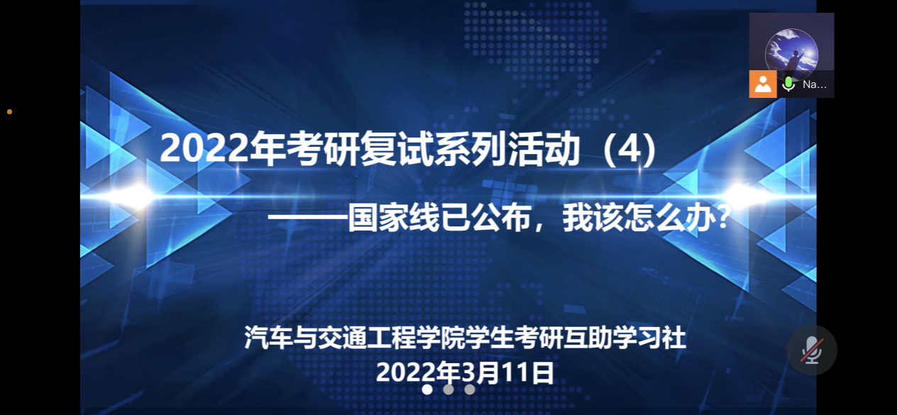 为精准助力考研学子备考,提升学生考研成功率,3月11日,汽车学院学生考研互助学习社通过腾讯会议APP举办2022年考研复试指导系列活动(4)——国家线已公布,我该怎么办。本次交流会由2018级辅导员刘波涛主讲,130余名考研学生参加。