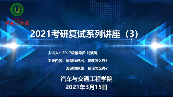 为精准助力考研学子,提高复试成功率,3月15日,汽车学院利用腾讯会议APP举办了2021考研复试指导系列讲座(三)——国家线已出,我该怎么办?本次交流会由2017级辅导员刘波涛主持,100余名考研学生参加。