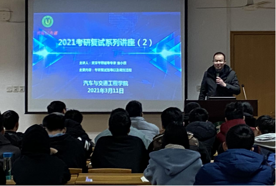 为精准助力考研学子备考,提升考研成功率,3月11日,汽车学院在学院311报告厅举办2021考研复试指导系列讲座——专家指导交流会,本次交流会邀请了资深考研辅导专家潘小跃老师为主讲嘉宾。院党委副书记、副院长杨建热情接待了潘老师,2017级辅导员刘波涛主持交流会,100余名考研学生参加交流。