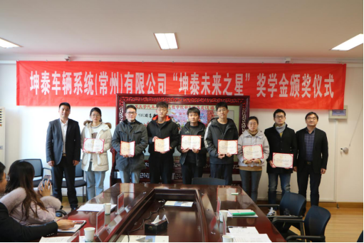 尹必峰院长代表学院致欢迎词,对坤泰车辆系统(常州)有限公司在我院设立奖学金、捐赠变速箱表示衷心的感谢,同时介绍了学院的发展、人才培养、研究特色。卞国胜副总经理介绍了公司的基本概况、产品布局、人才需求、未来愿景以及设立奖学金的初衷,对获奖学生表示祝贺并提出殷切希望,衷心欢迎更多的汽车学院学子能加入公司团队、施展才华、体现价值。变速箱捐赠仪式结束后,杨建副书记介绍了“坤泰未来之星”的评选原则、程序并宣读获奖学生名单,卞国胜副总经理、尹必峰院长共同为获奖学生颁发证书并合影留念。