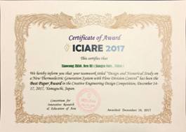 Paper of Student (Zhao Xiaocong) from our school— ‘Design and Numerical Study of a New Thermoelectric Generator with Flow DivisionControl’ won the ‘Best Paper Prize’ in ICIARE2017. Research work from team (Zhao Xiaocong, Zhou Xinchen, Bi Shanshan) in our school— ‘Thermoelectric Generator Designed for Vehicles’ won the ‘Grand Innovative Prize’ in CEDC2017. It is reported that this prize is specially set as the Top Honor Prize.