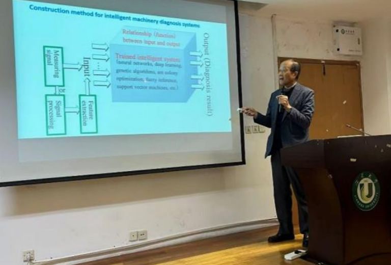 Participants reviewed progress and discussed talent training, research collaboration, and joint project applications. Prof. Chen presented on using genetic algorithms and genetic programming for intelligent fault diagnosis, including weak-signal detection, feature extraction, and fuzzy-rule optimization for inspection robots.