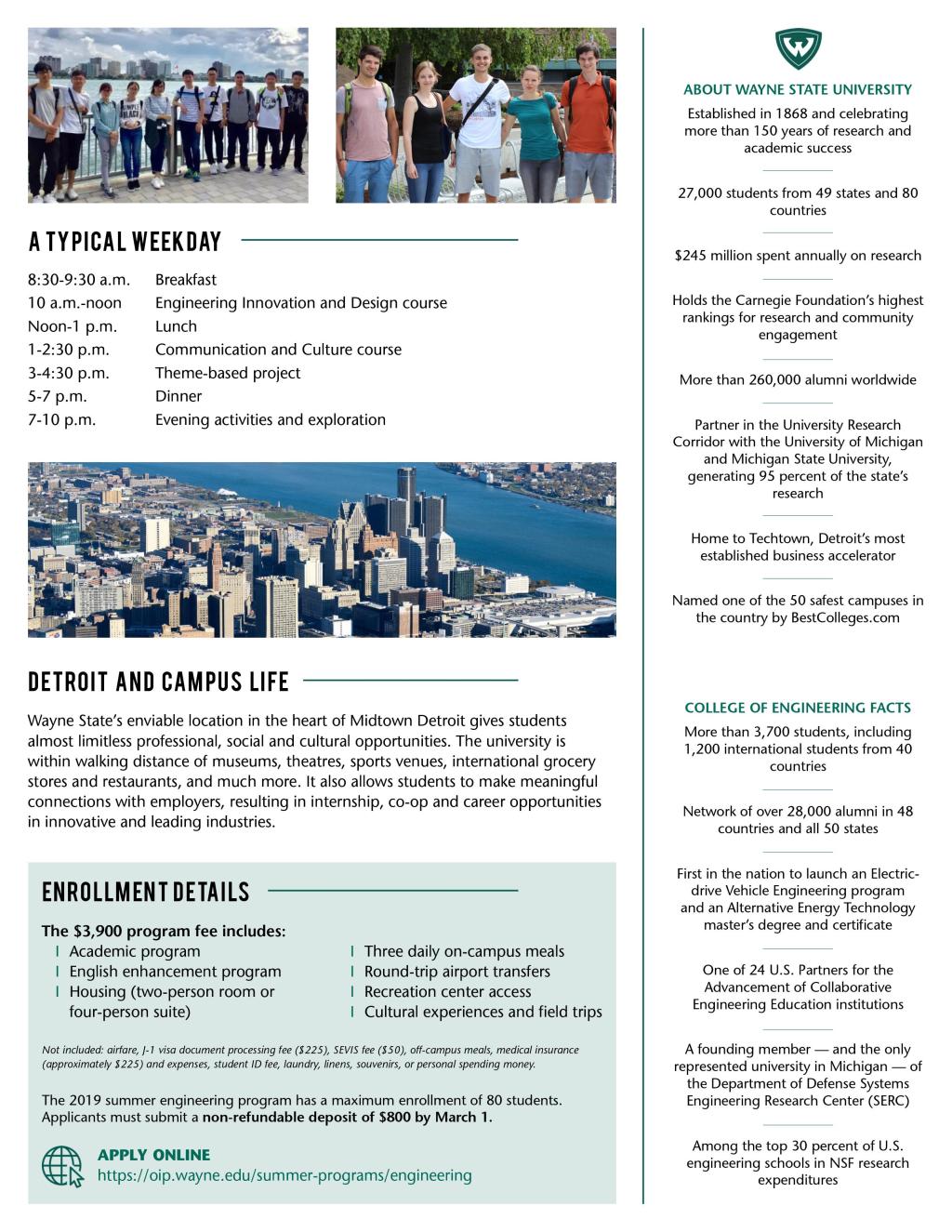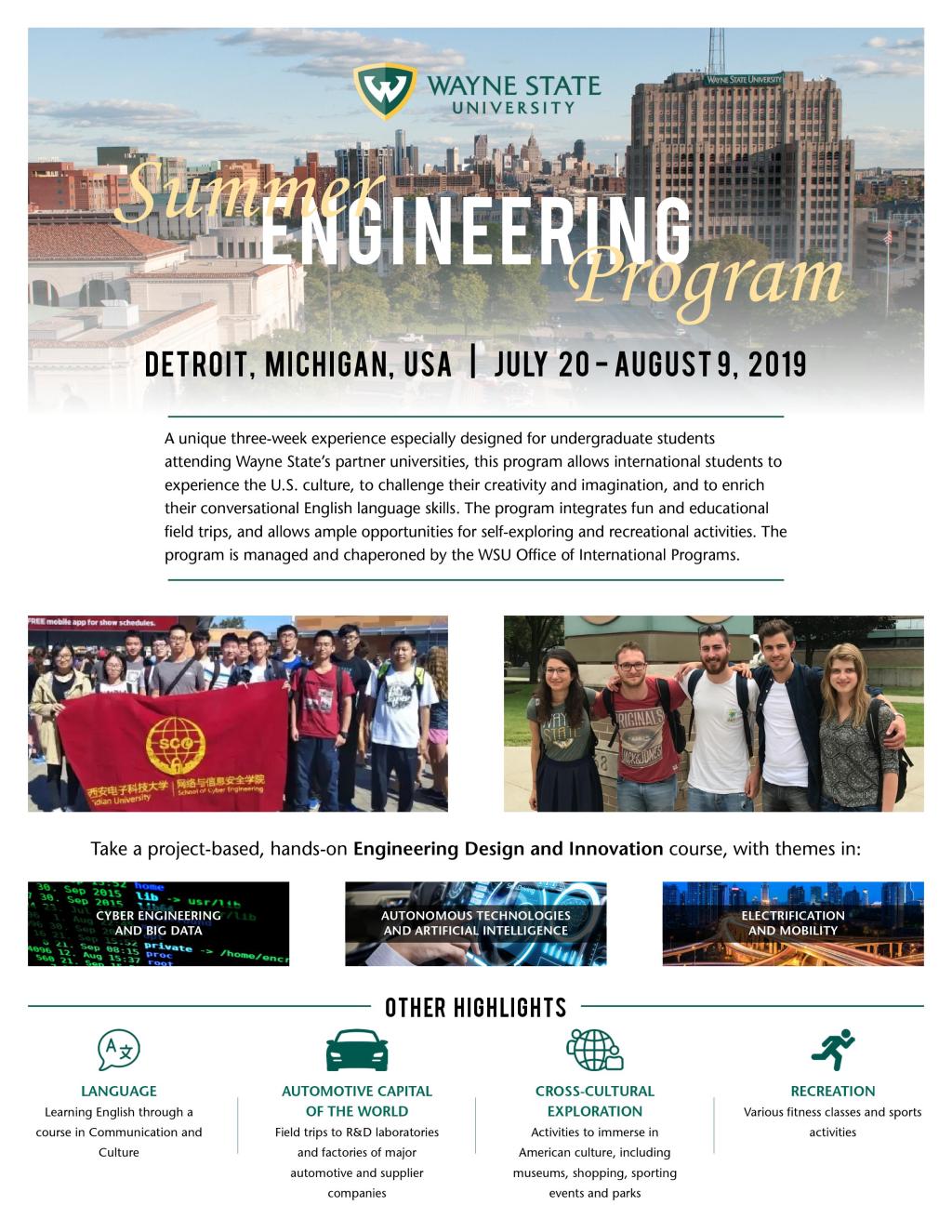 美国韦恩州立大学位于密歇根州三大汽车公司所在地,夏令营时间为2019年7月20日-8月9日,总费用约4000美元,详情请咨询耿老师13952885646。
