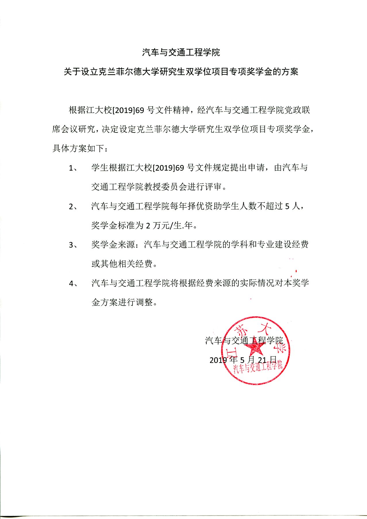 汽车与交通工程学院关于设立克兰菲尔德大学研究生双学位项目专项奖学金的方案