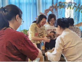 在食堂工作人员的帮助下,大家早早煮好了粽叶,泡好了糯米,准备好了包粽子所需要的盆、勺子、线、剪刀等工具,各种材料都整齐地摆在了桌子上。大家分组围站在一起,“先拿一片粽叶把它卷起来,卷一个角,这样米就不会漏出来……”,有经验的老师们积极主动地分享着包粽子的手法和技巧,同学们在说说笑笑中学会了如何拿捏粽叶、放多少糯米及系绳的方法。一张张翠绿的粽叶在大家手中翩翩起舞,填糯米、压紧实、封口、扎捆,巧手翻飞,不一会儿工夫,一只只馨香四溢的粽子就陆续诞生了。有的四四方方,有棱有角;有的一头尖尖,好似龙角。从无到有的成就感让大家笑在脸上,甜在心里。整个活动现场欢声笑语,其乐融融。大家在交流和劳动中,共话端午习俗,感受浓浓的节日气氛。