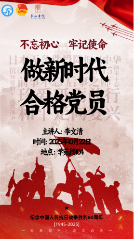 10月22日,汽车学院联合求知书院在学苑楼104教室举办了“纪念中国人民抗日战争胜利80周年”主题党课,特别邀请了校关工委副主任李文清老师作为主讲人,为汽车学院学生做讲座。本次讲座由汽车学院辅导员柴弘枫主持,汽车学院本科生第一、第二、第三党支部党员参加讲座。
