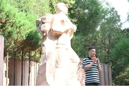 在张思德纪念广场,团队成员吴梓毓作为领诵人带领学员面向张思德花岗岩雕像和《为人民服务》讲话全文浮雕墙,诵读《为人民服务》,坚定为人民服务的信念。