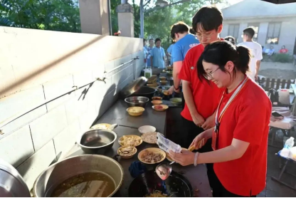 在团中央延安教育基地,团队成员们合理分工:洗菜、切菜、生火、炒菜、洗碗,每个环节都井井有条。队员们通力合作,利用已有的食材,做出了简单可口的饭菜,体悟了艰苦奋斗、自力更生的精神。