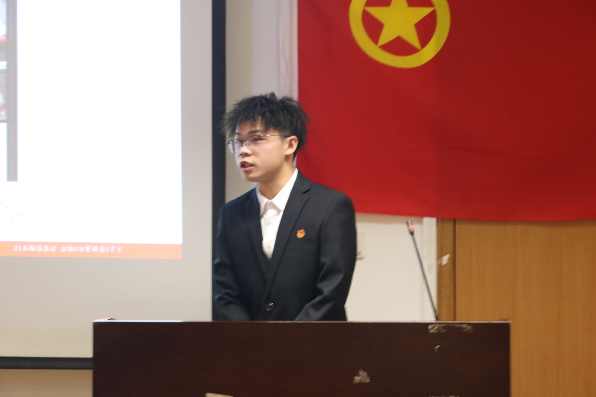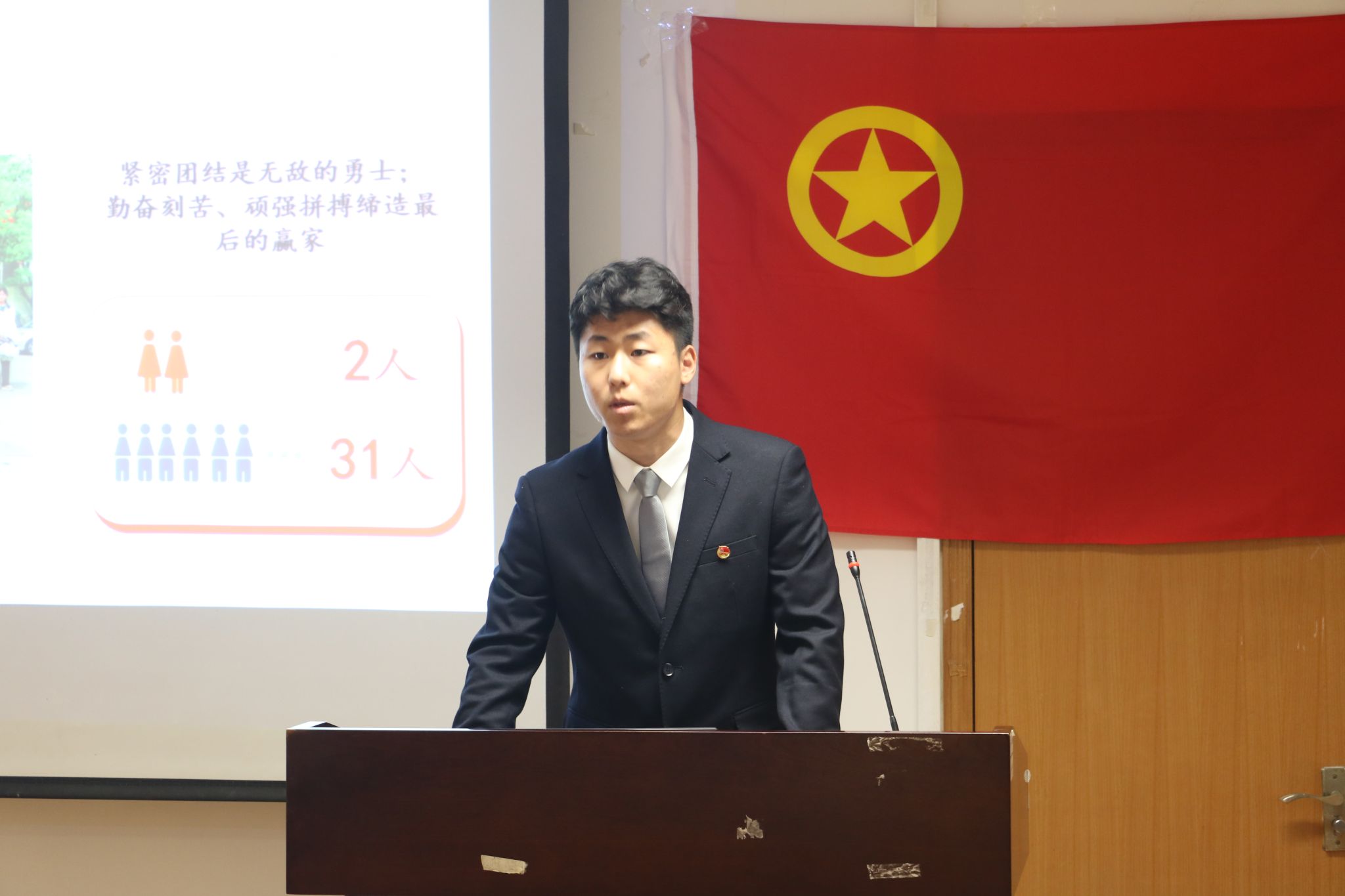 会议伊始,全体参会人员唱团歌《光荣啊,中国共青团》。在团歌结束后由院团委副书记陈佳楠老师带领全体参会人员重温“入团誓词”。