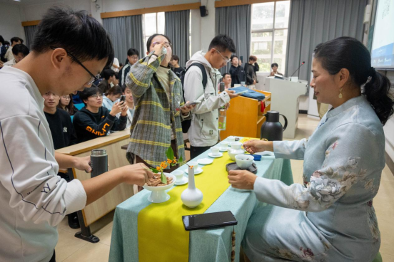 在互动环节,同学们围绕茶叶品鉴、茶艺历史等话题踊跃提问,与主讲人进行了深入交流。讲座结束后,师生们意犹未尽,纷纷上前近距离观赏精美茶器,品鉴馥郁茶香,在亲身实践中深化了对茶艺之美的理解。